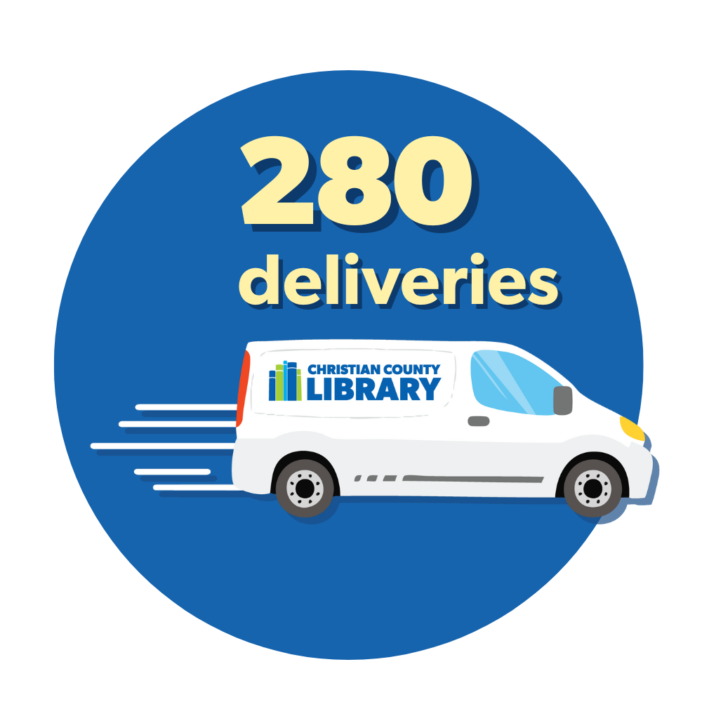 Each month, Outreach staff drive 160 miles across Christian County to deliver about 300 materials. In 2024, over 3,300 items were transported to 280 homes. This service wouldn’t be possible without the help of library volunteers who assist with pulling, sorting and packing materials for delivery. If you want to make a difference in someone’s life, consider volunteering! For more information and to apply, email outreach@christiancountylibrary.org.